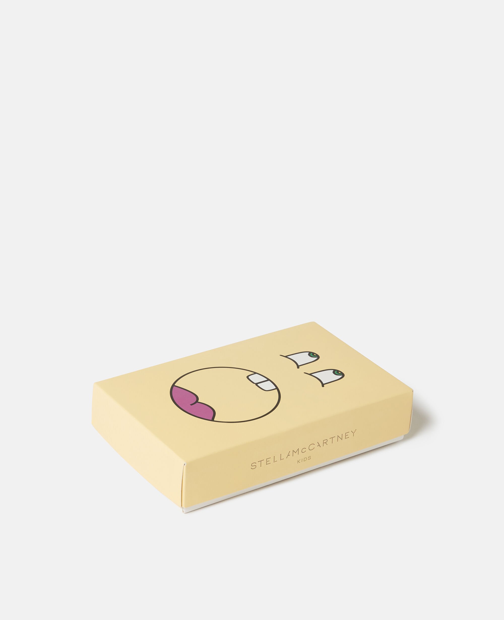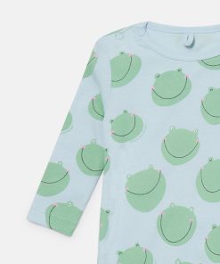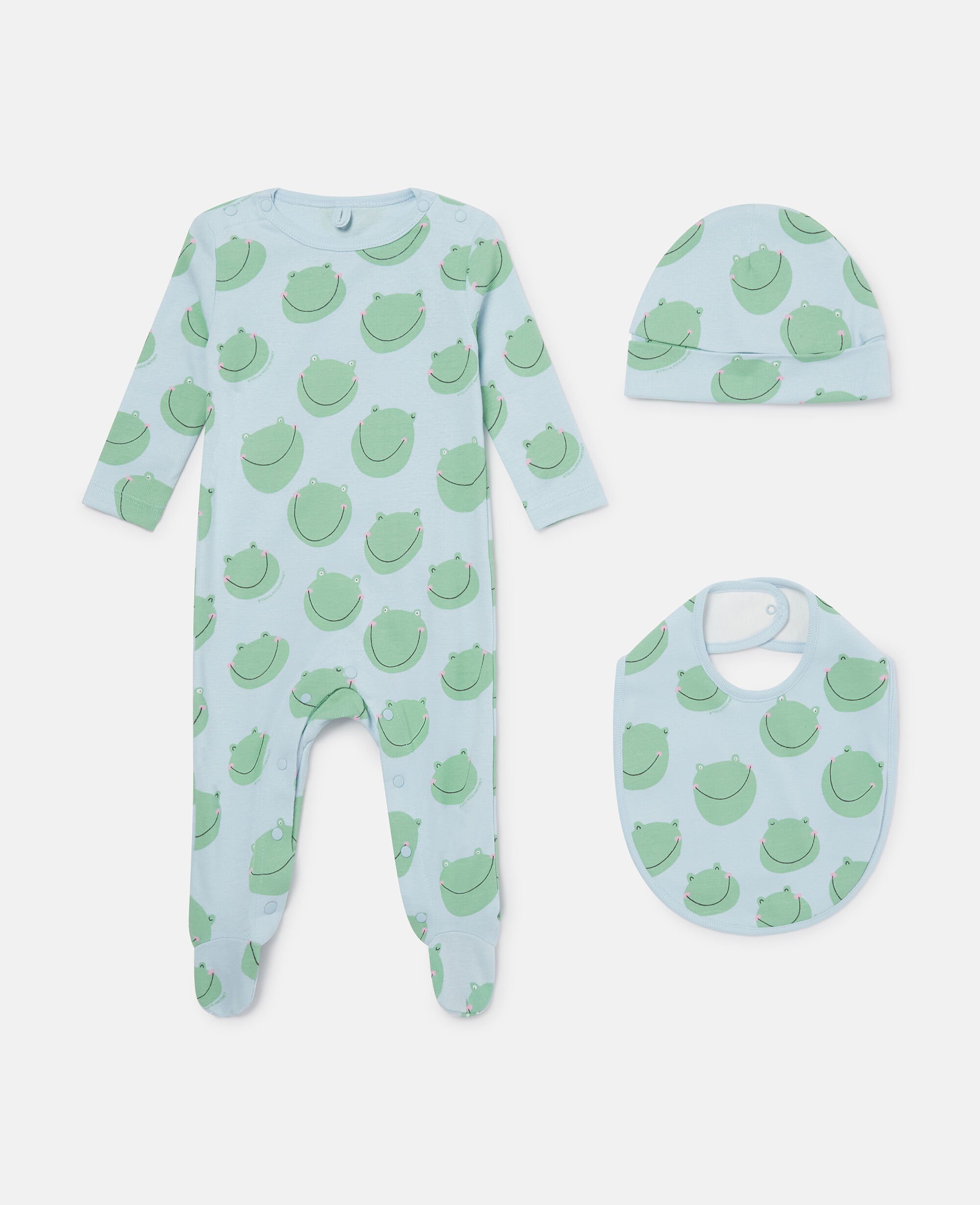 The Stella Kids Spring Summer 2025 collection playfully shows the next generation that animals are friends, not fashion. The season’s funny, froggy face is printed on this soft, organic cotton romper, hat and bib set.