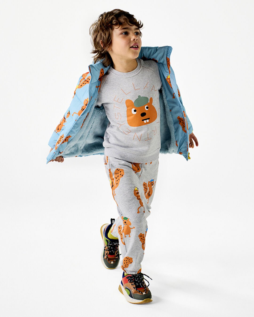 Animals are friends, not fashion! Our latest Stella Kids sustainable luxury childrenswear collection includes chummy, cheeky squirrel faces printed on these organic cotton sweatpants. Pair them with the coordinating sweatshirt.