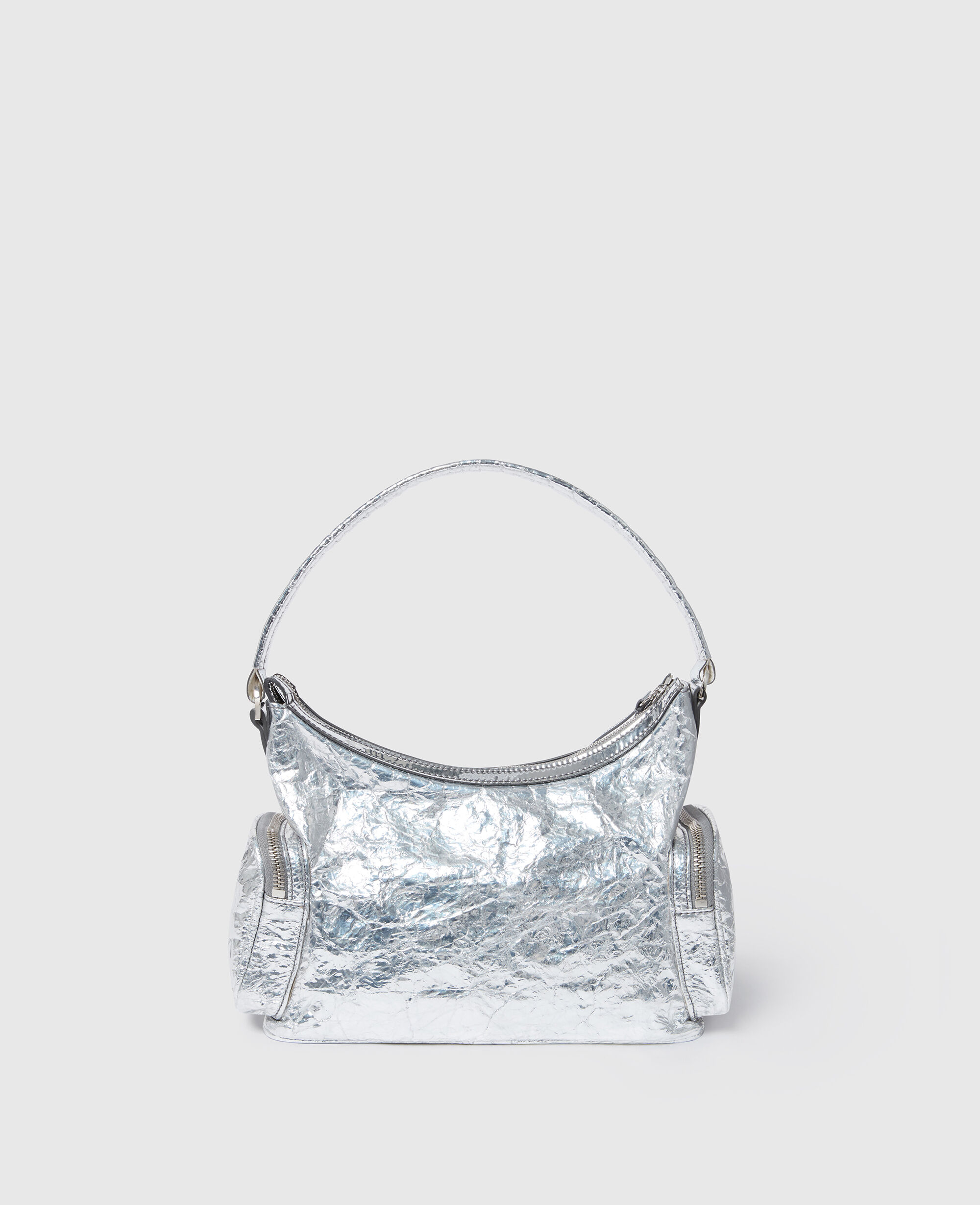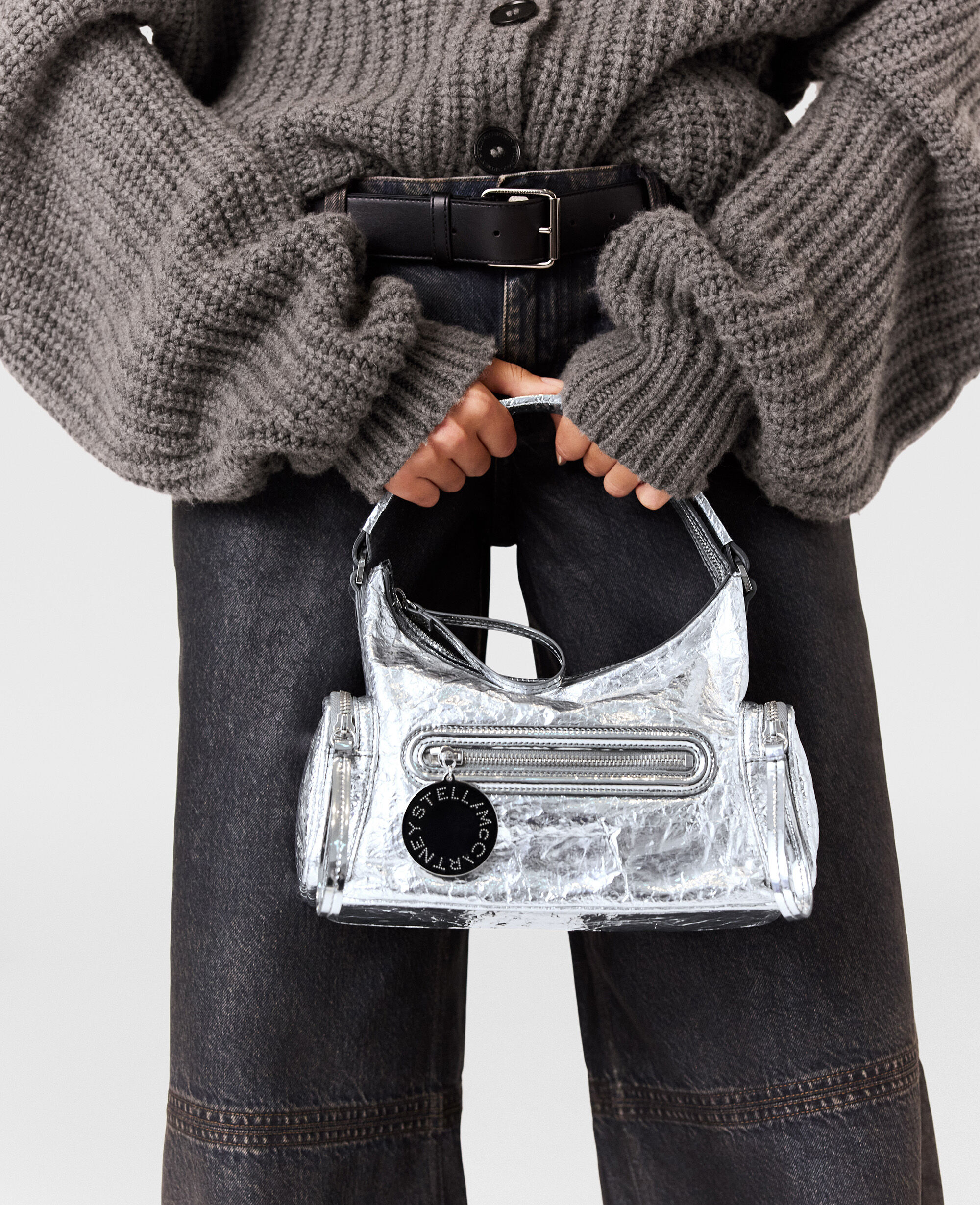 Stella McCartney’s Dartmoor family is introduced for Winter 2025. A modern, multi-pocketed silhouette that references the 00s, the crossbody bag is handcrafted in Italy from vegan alternatives to animal leather with a crinkled, metallic finish.