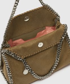 A more compact version of our iconic vegan luxury bag, the Falabella mini tote bag is small but mighty. Consciously crafted from our grained vegan Shaggy Deer fabric and finished with a diamond-cut chain made from recycled brass and aluminum, this tote has a handy inside slip pocket and a monogrammed lining made from post-consumer recycled polyester.