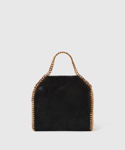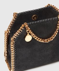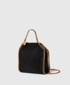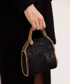 Elegant and dainty, the Falabella tiny tote bag is a Stella McCartney icon made new. The little black bag is consciously crafted from vegan Shaggy Deer fabric with semi-gloss grain and a signature diamond-cut chain in recycled brass and aluminium. It is fully lined with a monogram lining made from post-consumer recycled polyester.
