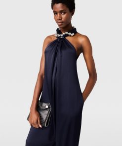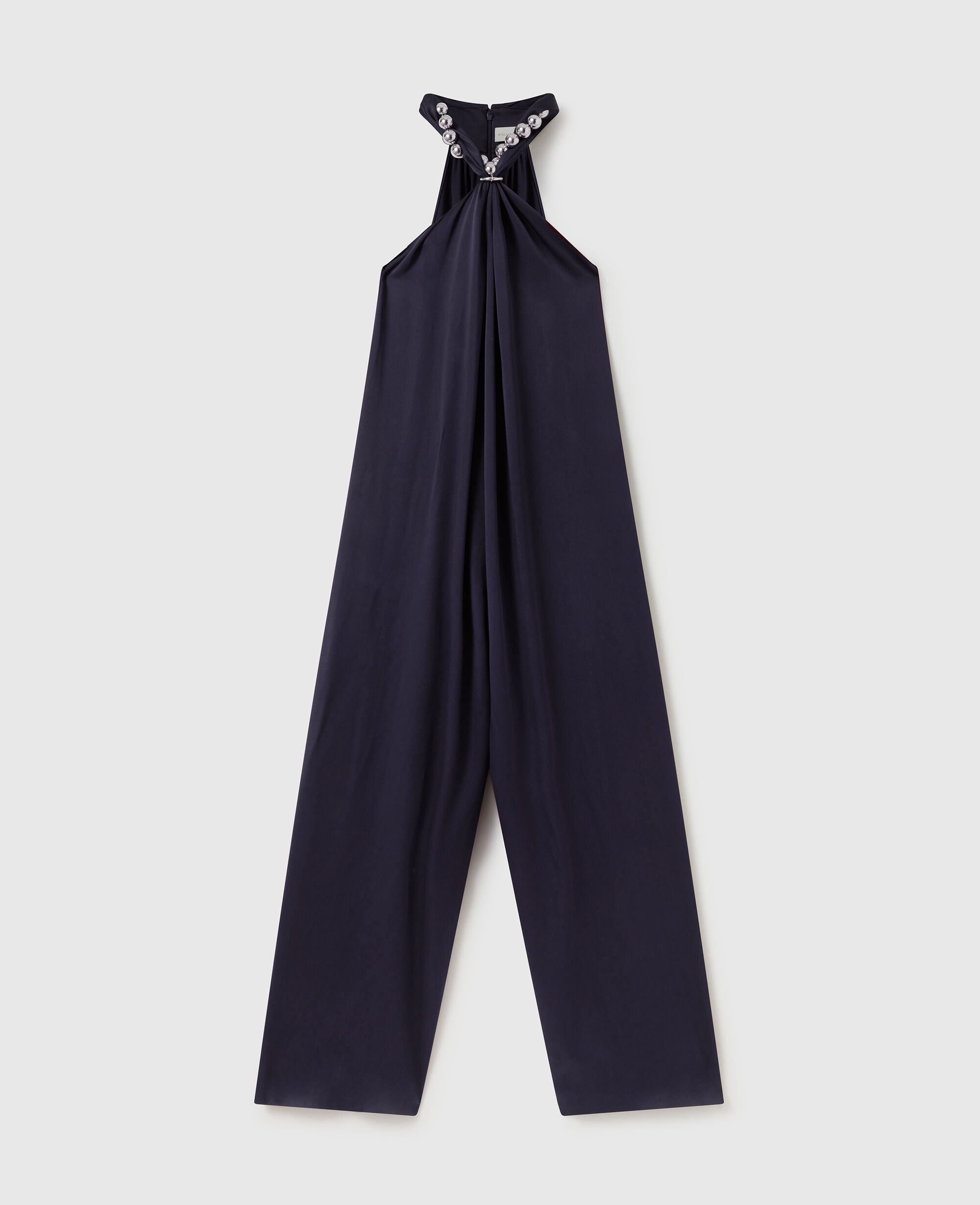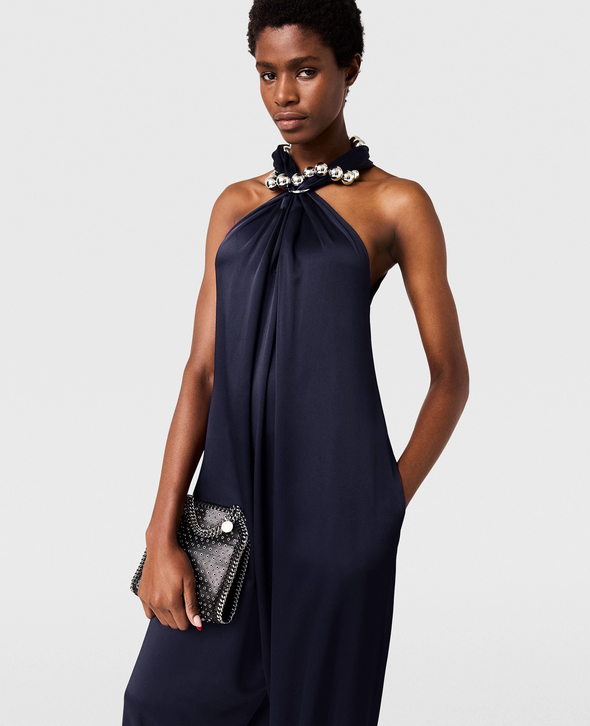 Spun from lustrous, forest-friendly viscose satin, this silky-smooth jumpsuit begins wrapped around a ball-chain collar. Cascading straight passed the hips to floor-length cuffs, it’s thoughtfully stitched with slip pockets on either side for classic Stella ease.