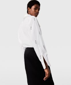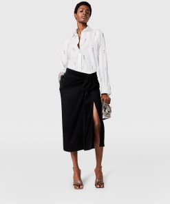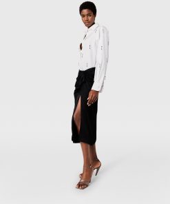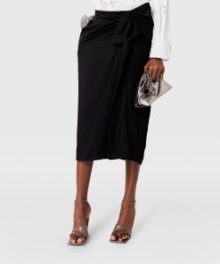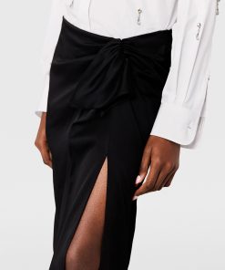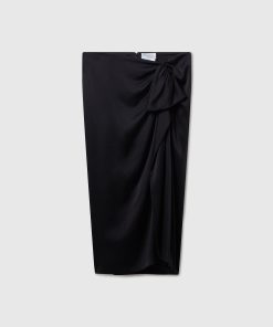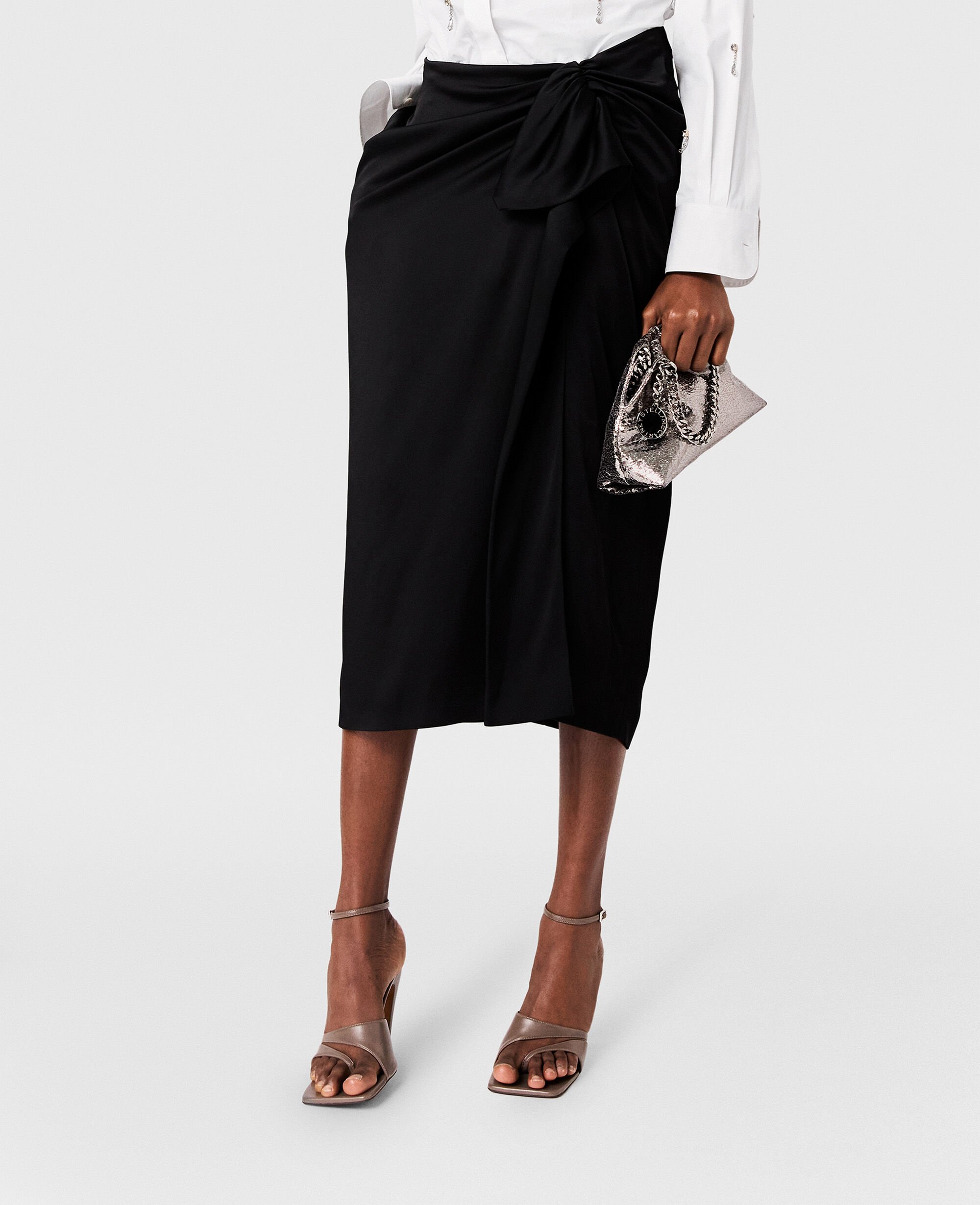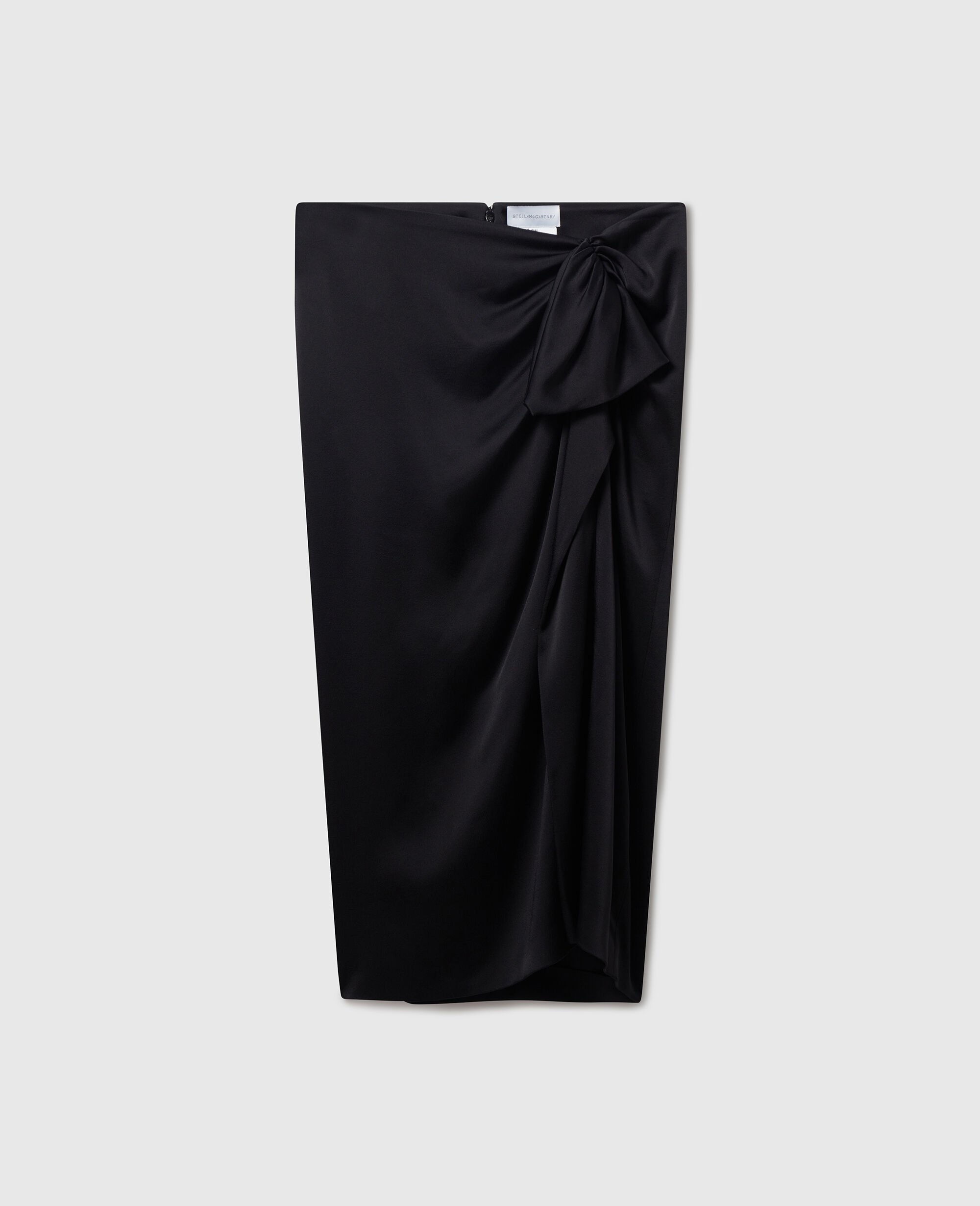 A study in fluidity and femininity, this asymmetric midi skirt begins at a high rise – wrapping around the waist and with a knotted draping at the hip. Floating over the body in lustrous forest-friendly viscose satin, slip it on with some kitten heels and enjoy how its outline flows with each step.