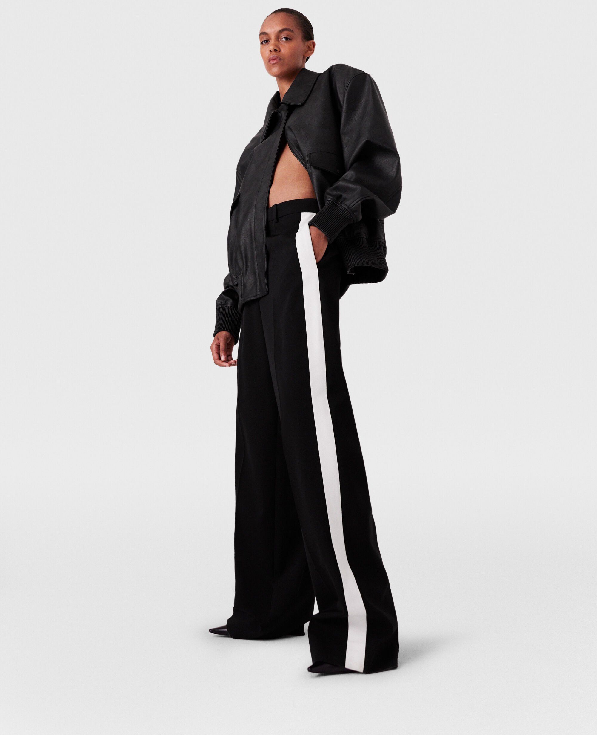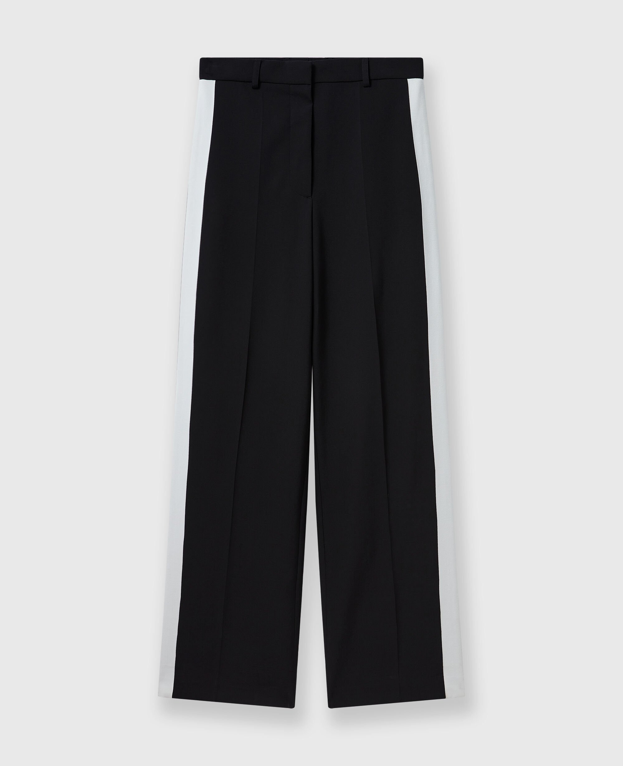 Iconic Savile Row tailoring is foundational to every Stella McCartney collection. For Spring 2025, these pants are immaculately constructed from fully traceable RWS-certified wool and tailored to a low-rise, straight-leg silhouette with tuxedo stripes down both sides.