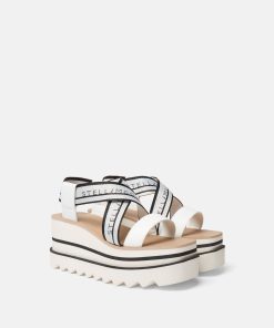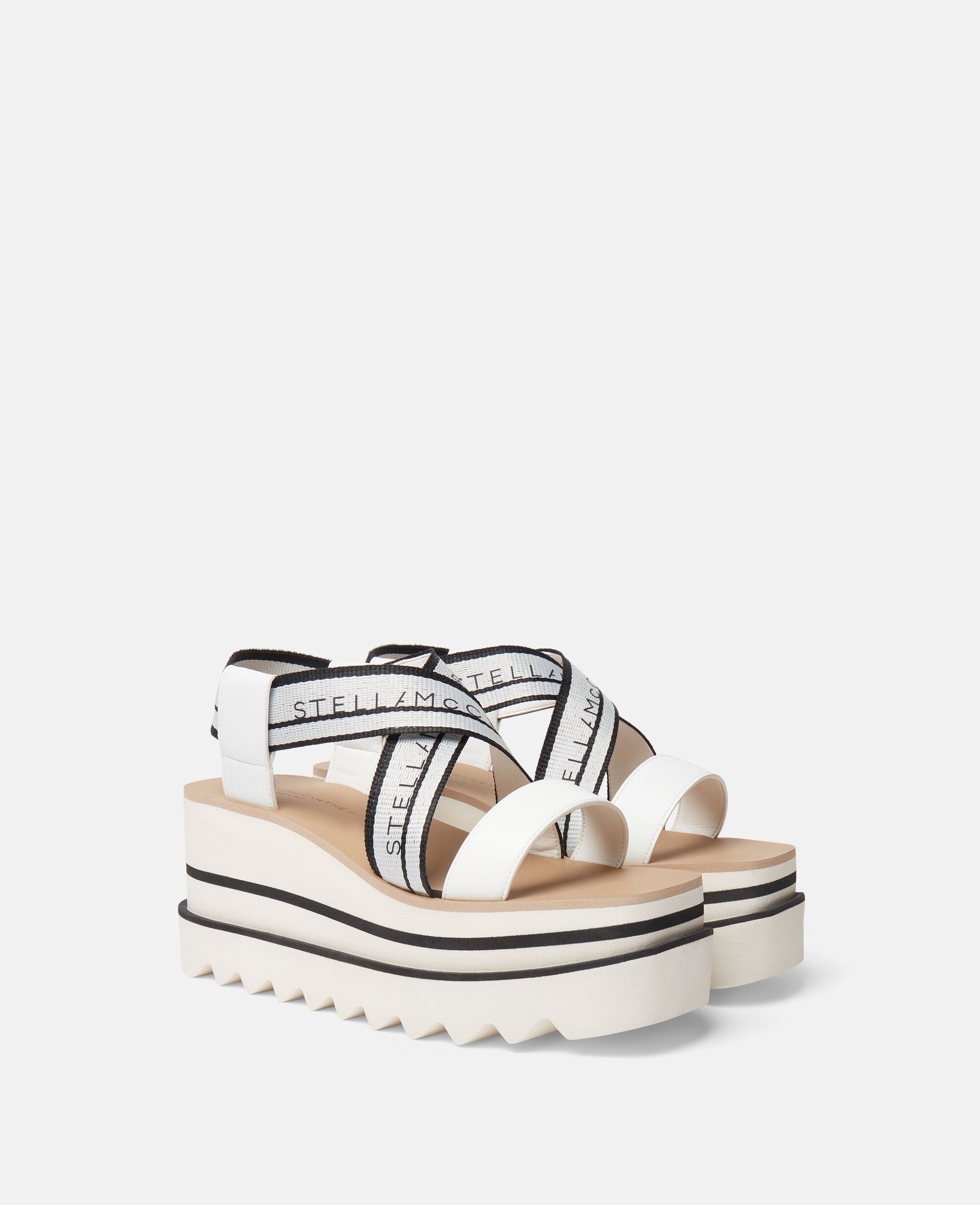 Elevate springtime sets with these Sneak-Elyse platform sandals in bright white. The athleisure-inspired sandals have a logo webbing strap upper, elevated by a striped wedge heel and signature saw-edge micro sole.