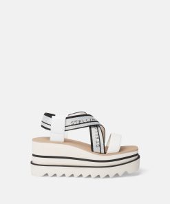 Elevate springtime sets with these Sneak-Elyse platform sandals in bright white. The athleisure-inspired sandals have a logo webbing strap upper, elevated by a striped wedge heel and signature saw-edge micro sole.